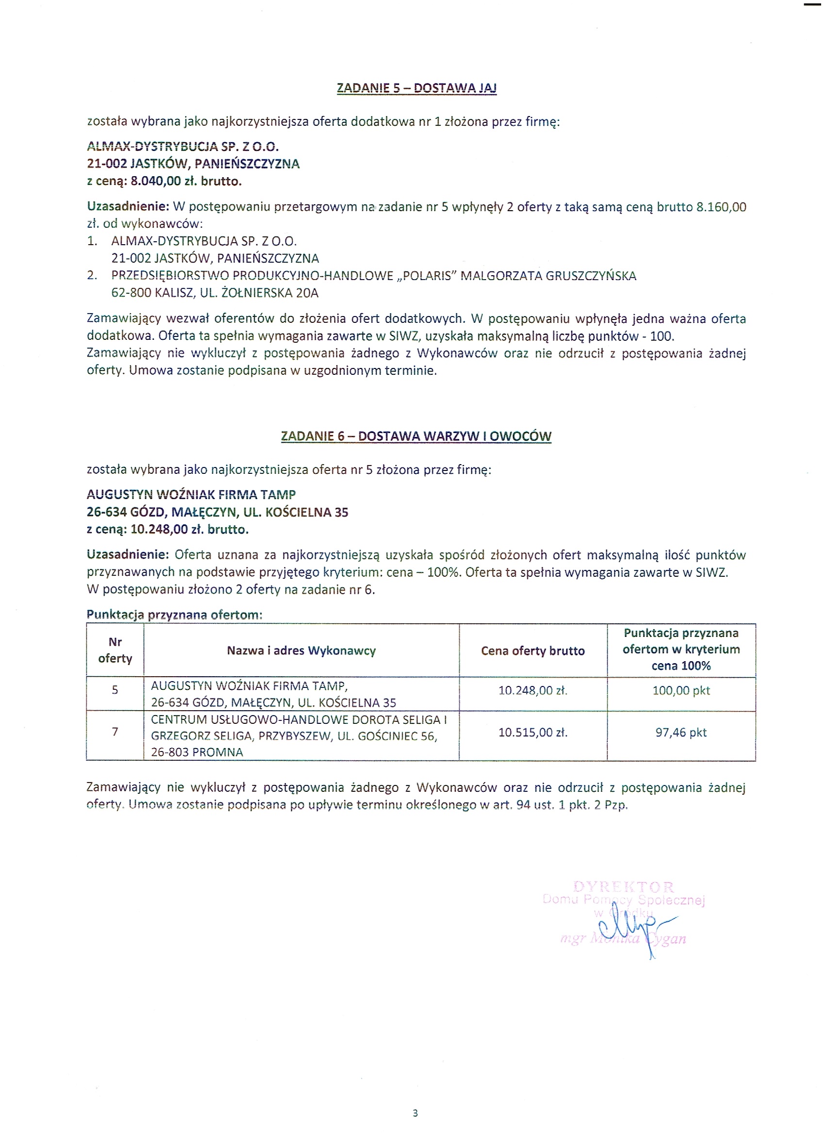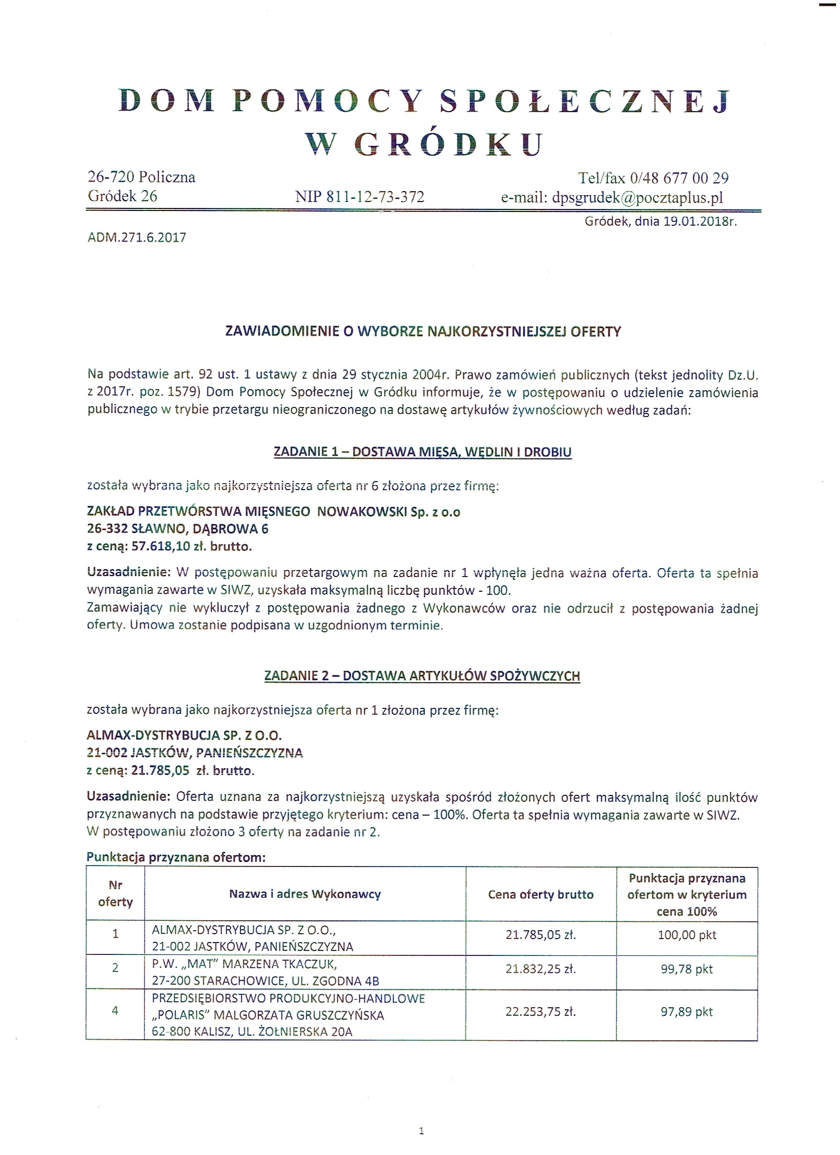 ZAWIADOMIENIE O WYBORZE NAJKORZYSTNIEJSZEJ OFERTY W PRZETARGU NA DOSTAWĘ ARTYKUŁÓW ŻYWNOŚCIOWYCH NA ROK 2018